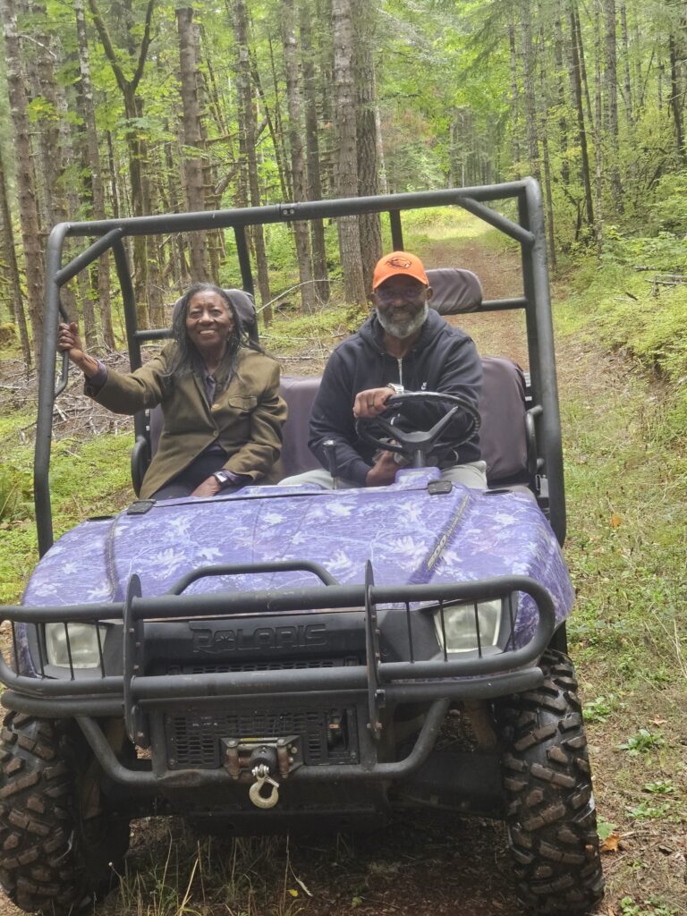Sandra clears weeds while Sid makes sure she doesn’t roll down the hill into the newly plowed field.