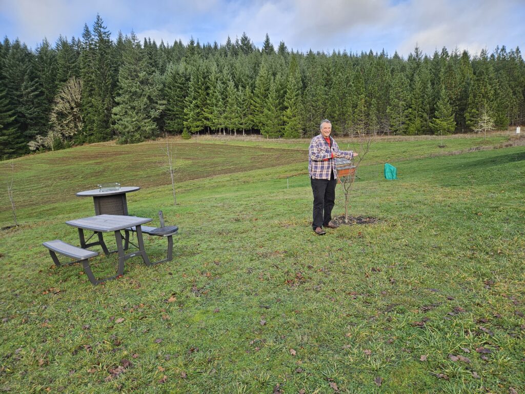 Our spray company guy dropped off the map, so Sid undertook spraying the fruit trees!
